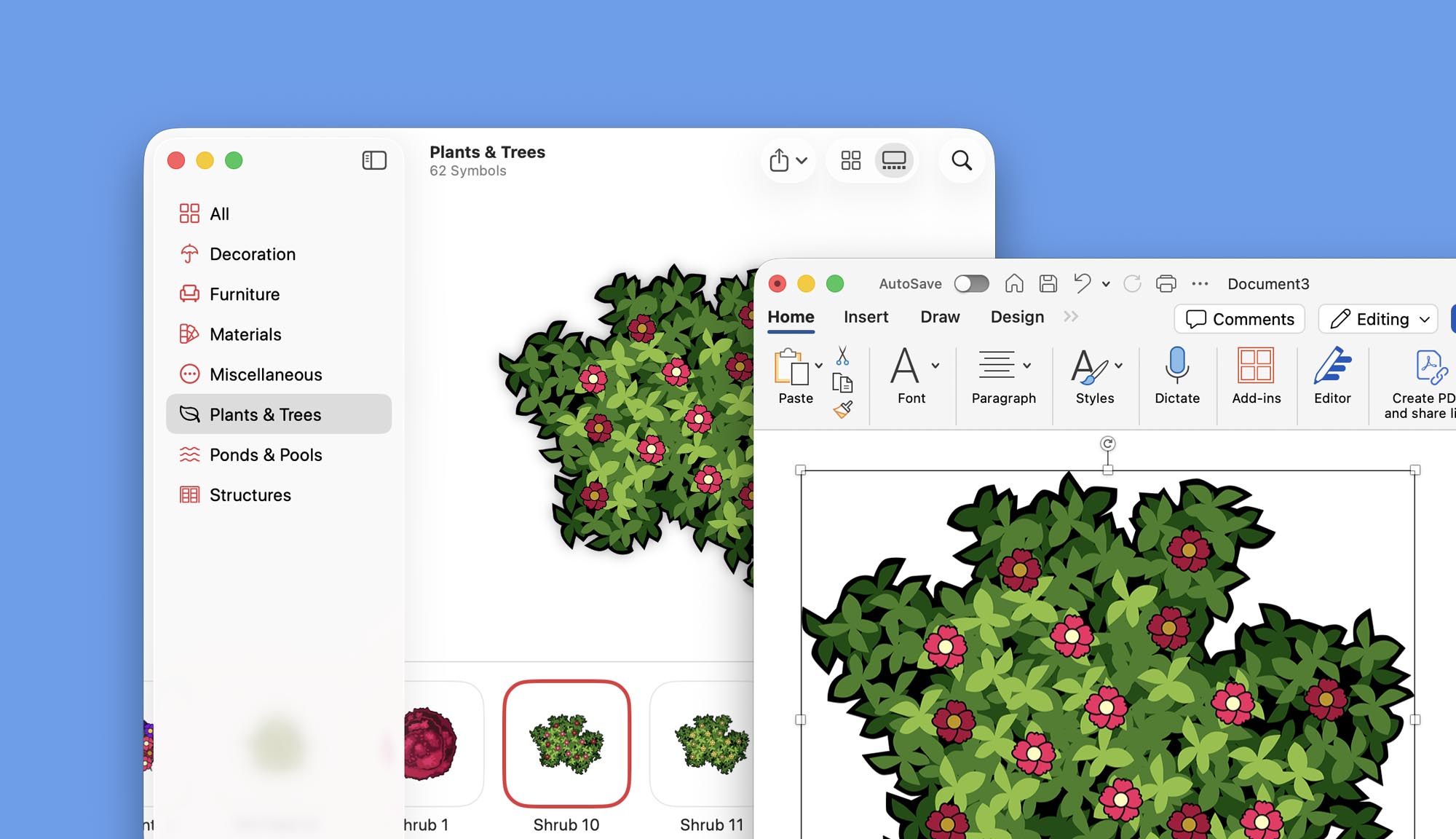 Garden Plan Graphics is a catalog library that contains over 700 vibrant and colorful, professionally-drawn vector graphics for use in garden, outdoor and landscaping plans. Designed to integrate with almost all macOS applications. Symbols can dragged and dropped into your favourite and preferred documents, such as Word, Illustrator, Text Edit and more. Graphics can also be exported as scalable content and edited using MacDraft or other vector graphics tools, to create custom symbols that will include shared design styles, with your current projects.