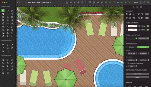 MacDraft includes large range of tools and options for drawing shapes, curves and lines quickly and easily. Use the tools to draw the outlines for your orders, grass areas, patios and possibly the edge of the boundaries. You can then use the options displayed in the Properties panel, when an object is selected, to alter its size, line styles and more. You can even control the background color of your design to make it easier to setup a working template for your landscape designs.
